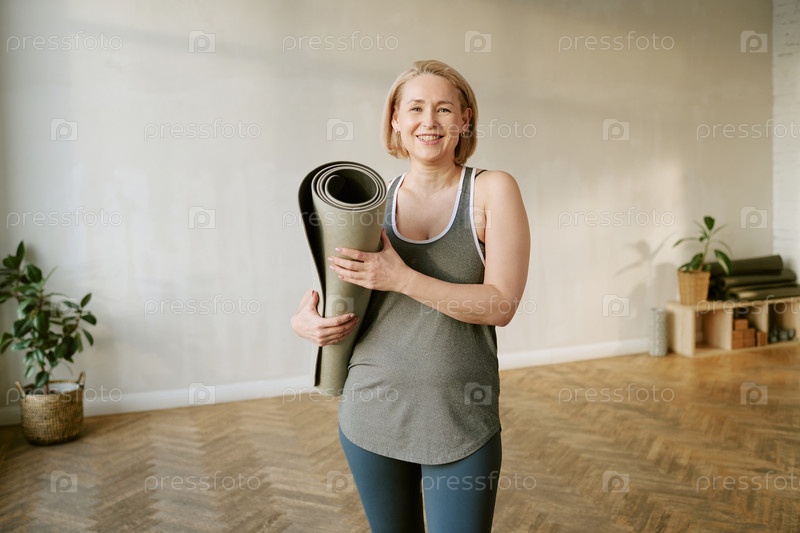 Портрет женщины среднего возраста, позирующей с матом для йоги в студии