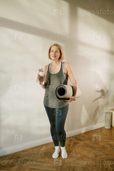 Женщина среднего возраста, стоящая в помещении с матом для йоги и бутылкой воды