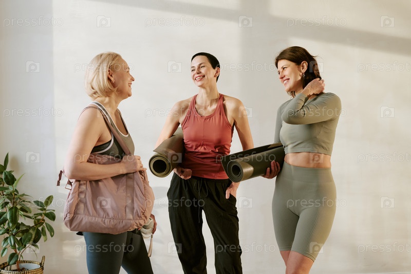 Группа женщин среднего возраста, улыбающихся и беседующих после занятий йогой