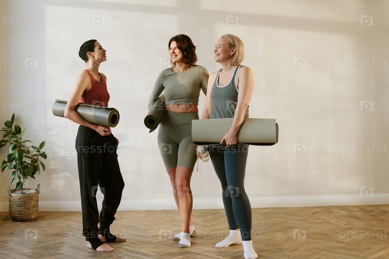 Три молодых взрослых женщины разных этнических групп, улыбающиеся после занятий йогой