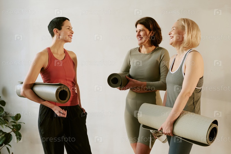 Три женщины среднего возраста улыбаются, держа маты для йоги в помещении