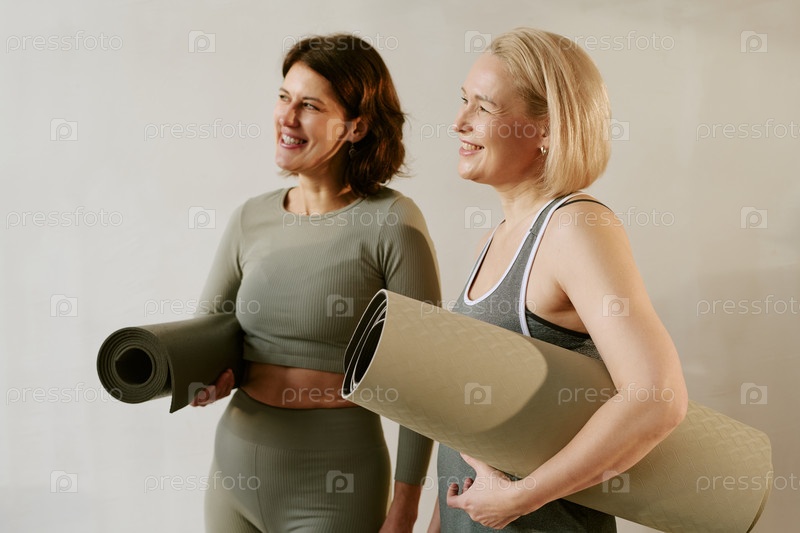 Женщины среднего возраста улыбаются, держа маты для йоги в помещении