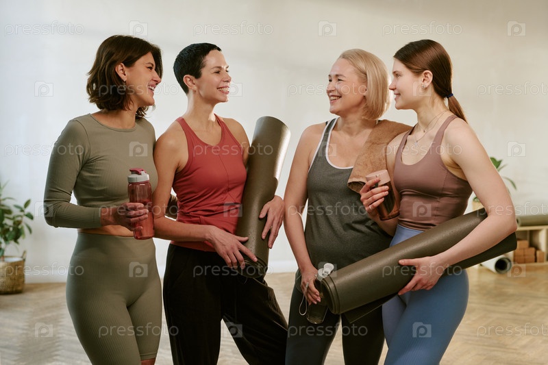Мультиэтнические женщины разного возраста улыбаются и общаются после занятий йогой