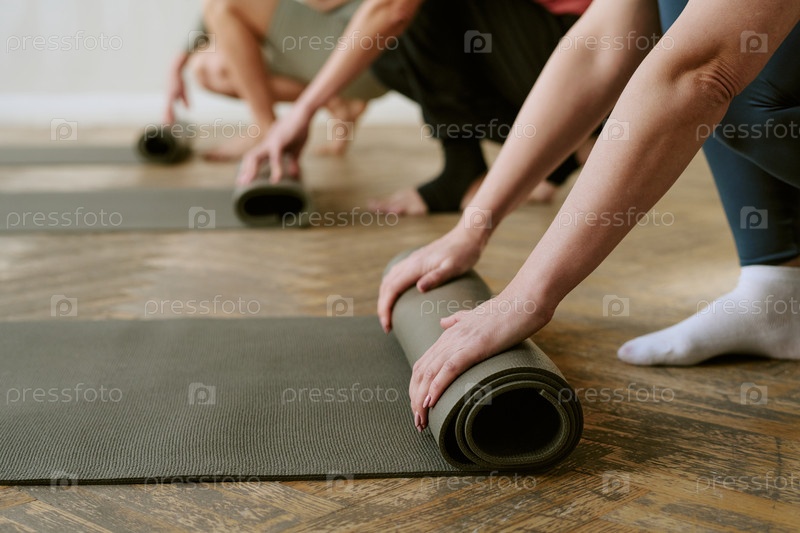 Молодые взрослые женщины Rolling Yoga Mats после окончания группового упражнения