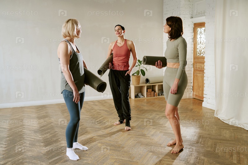 Три молодых взрослых женщины, общающиеся после занятий йогой в помещении