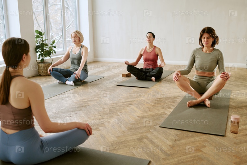 Группа женщин среднего возраста, практикующих йогу и медитацию в помещении