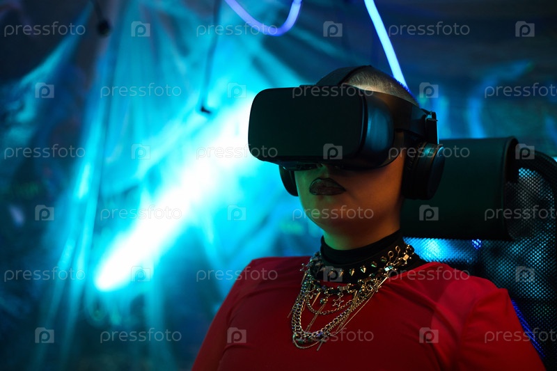 Молодая взрослая кавказская женщина, носящая гарнитуру виртуальной реальности, исследует кибербезопасность