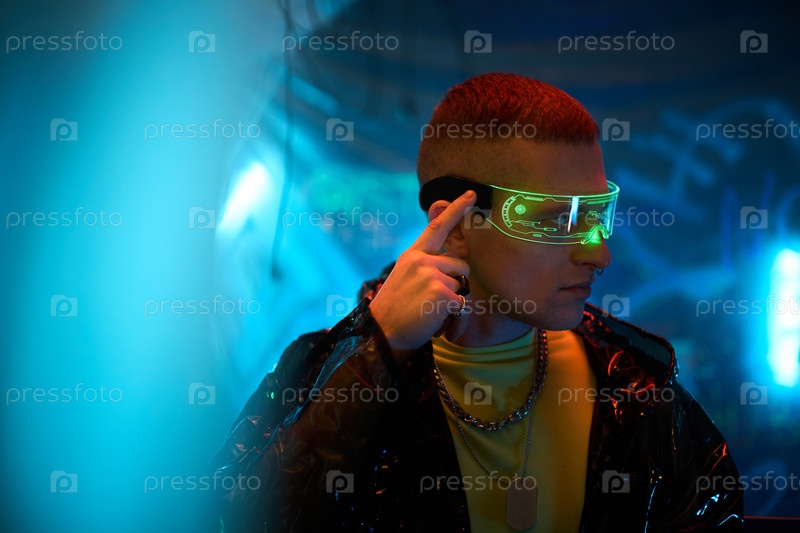 Молодой белый мужчина с футуристическими очками работает на виртуальном интерфейсе