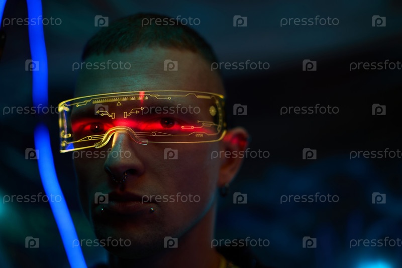 Портрет молодого белого мужчины, носящего футуристические очки дополненной реальности