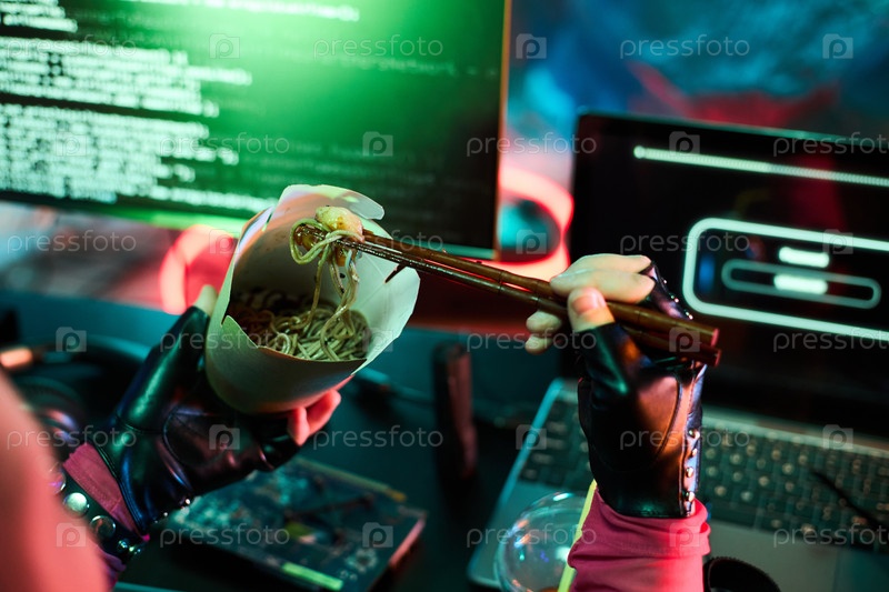 Женщина ест лапши во время взлома на ноутбуке