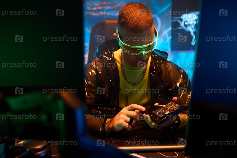 Молодой белый мужчина взламывает компьютерное оборудование в темной комнате кибербезопасности
