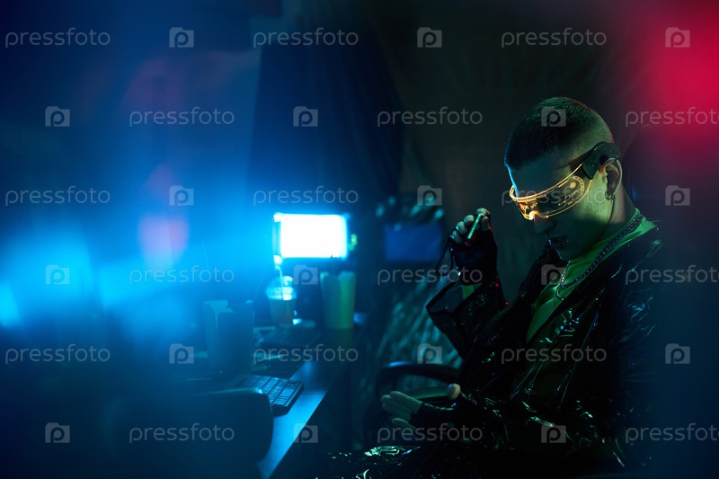 Молодой взрослый кавказский мужчина, носящий неонный визор, работает на компьютере в темной комнате