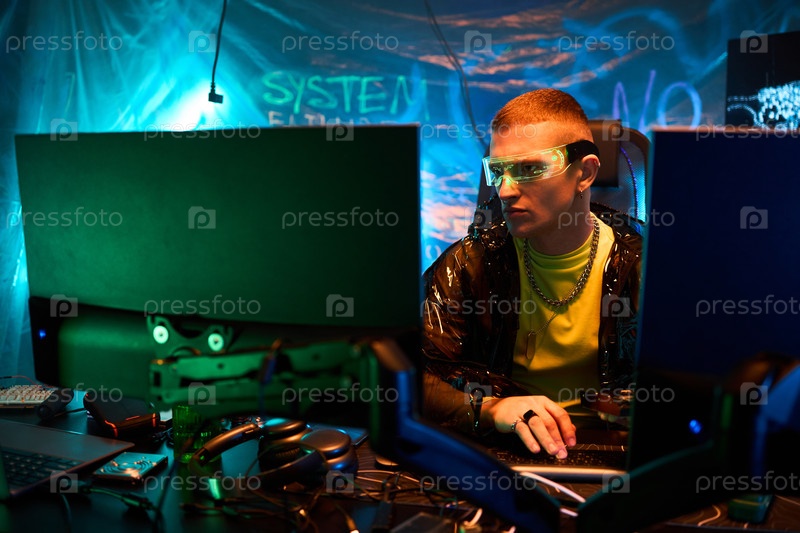 Молодой белый мужчина взламывает компьютерную систему в темной комнате с неоновым освещением