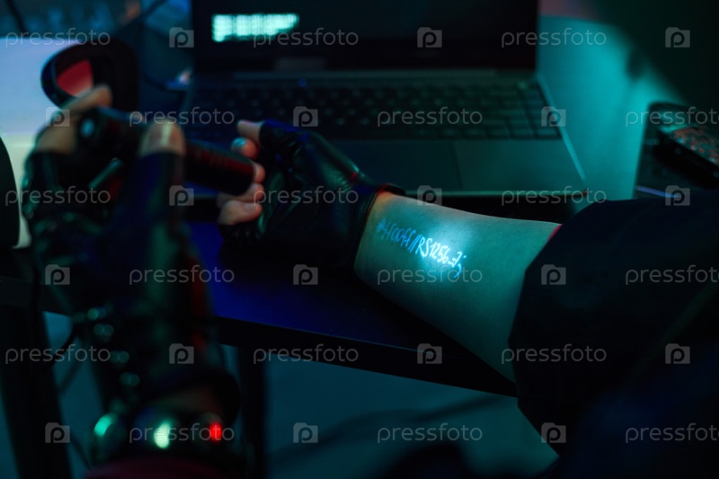 Молодой человек взламывает компьютер с кодом пароля, проецированным на руку