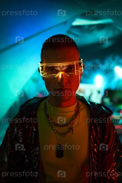 Портрет молодого белого мужчины, носящего неонный визор и стоящего в лаборатории хакеров