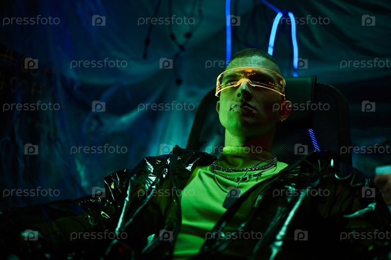 Молодой взрослый белый мужчина с футуристическими очками сидит в темной комнате
