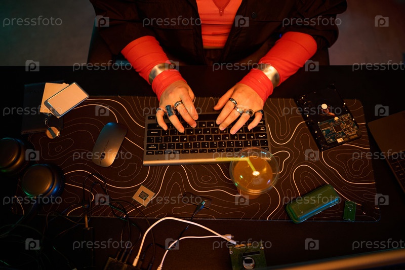 Молодая женщина взламывает компьютерную систему с помощью клавиатуры на рабочем столе