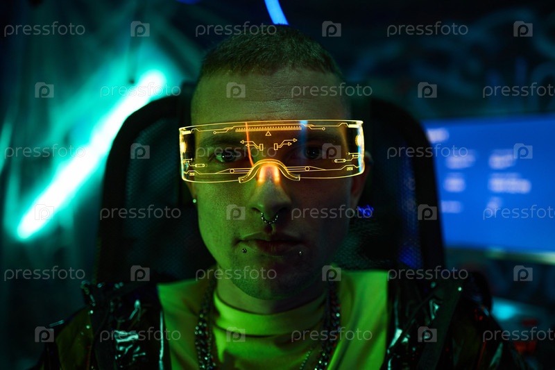 Портрет молодого человека, носящего киберпанкский неоновый визор и работающий с компьютером