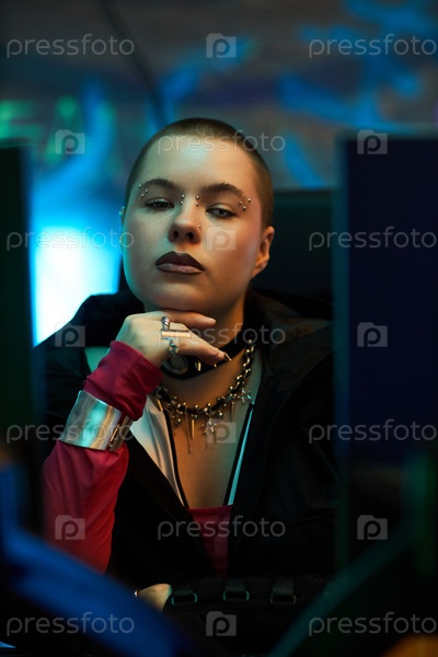 Портрет молодой взрослой белокожей женщины, пристально глядящей во время взлома компьютера