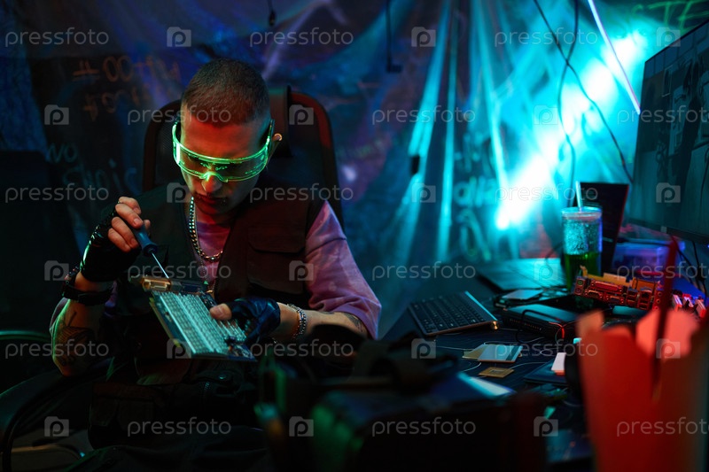 Юный хакер, модифицирующий компьютерное оборудование в темной неоновой комнате