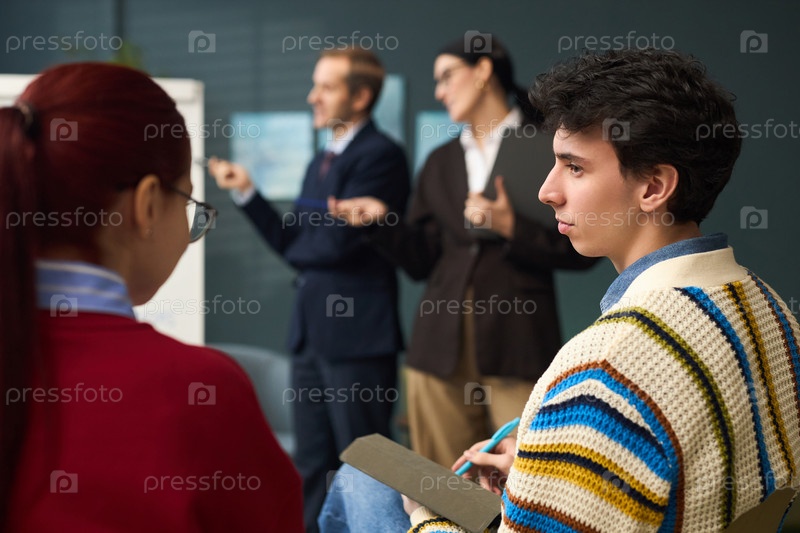 Молодой человек слушает во время деловой презентации в офисной обстановке