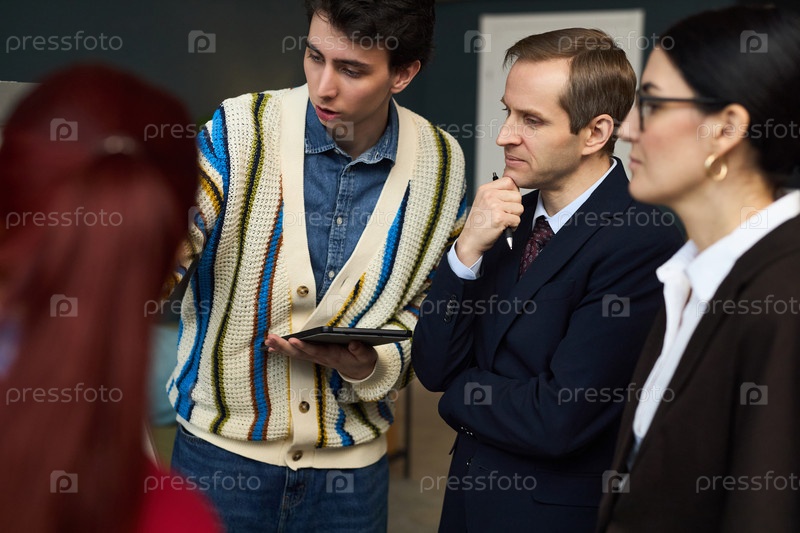 Молодой человек объясняет проект различным коллегам среднего возраста