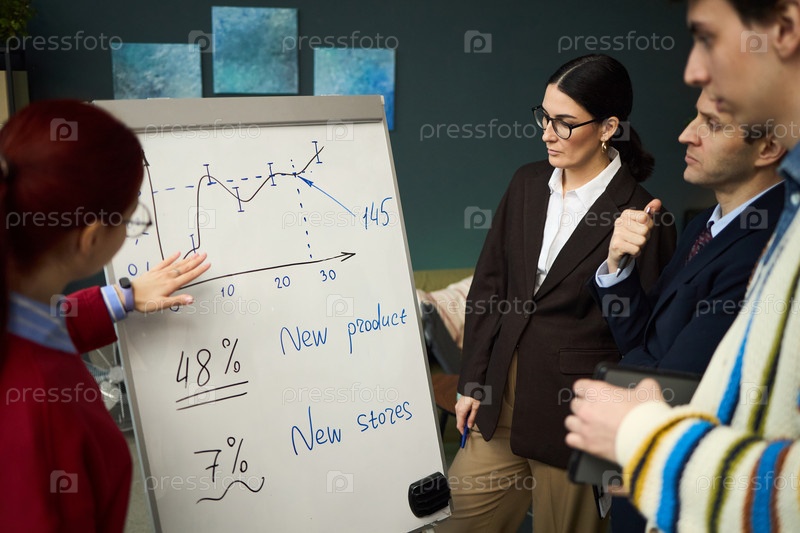 Молодая взрослая женщина объясняет график продаж различным коллегам