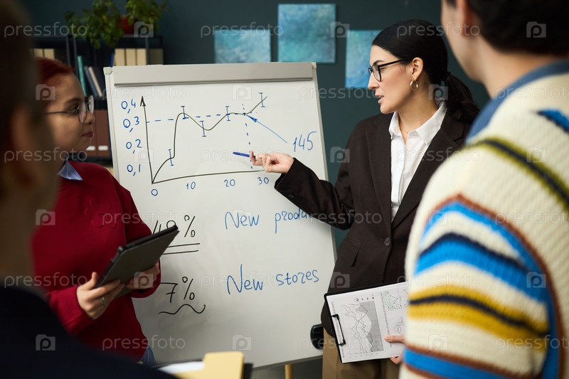 Молодая взрослая женщина объясняет данные продаж разнообразной команде во время встречи