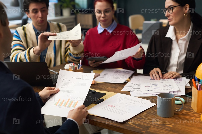 Различные молодые взрослые сотрудничают во время деловой встречи, анализируя документы