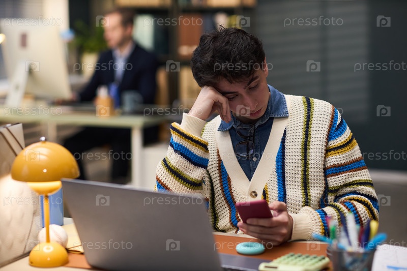 Молодой человек сидит за рабочим столом и смотрит на смартфон, чувствуя себя скучным