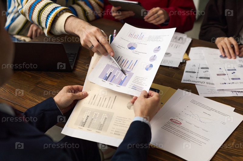 Молодой взрослый человек анализирует финансовые графики во время деловой встречи