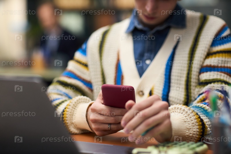 Молодой человек, использующий смартфон во время работы за столом в офисной обстановке