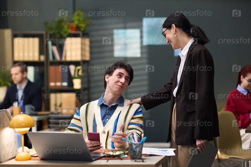 Молодой человек улыбается, разговаривая со своей коллегой средних лет в офисе