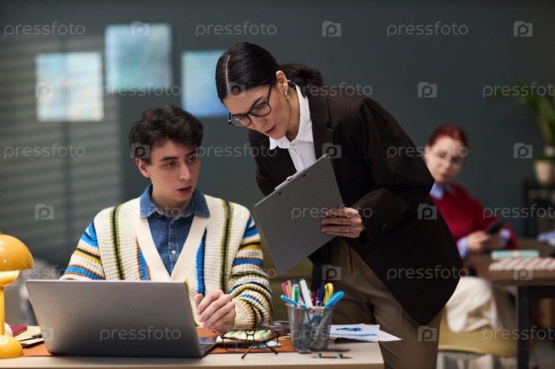 Женщина среднего возраста контролирует молодого взрослого мужчину, работающего на ноутбуке