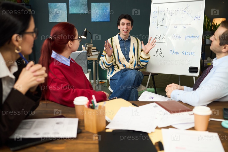 Молодой человек объясняет бизнес-стратегию разнообразной команде в офисе