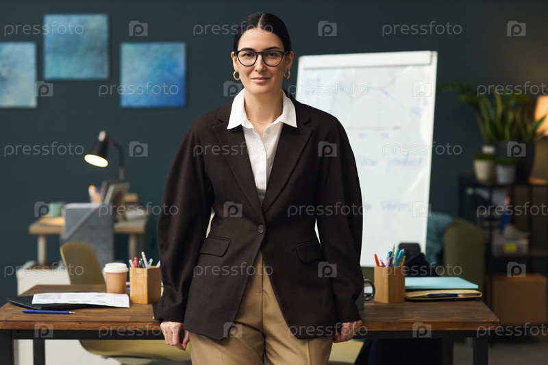 Портрет молодой женщины в костюме, стоящей уверенно в офисной обстановке