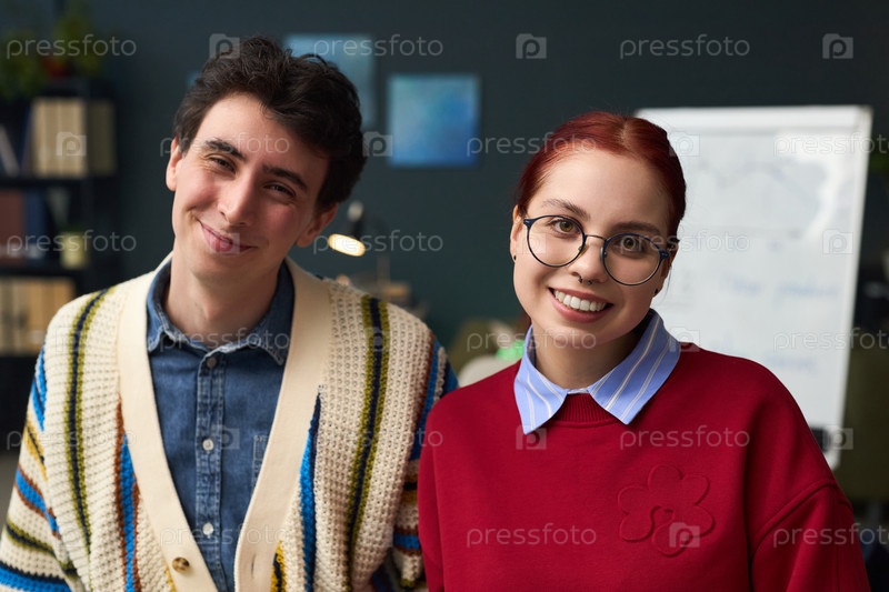 Портрет молодого человека и юной женщины, улыбающихся в помещении