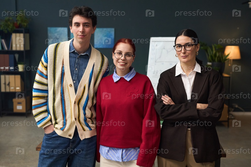 Портрет разных молодых взрослых, улыбающихся и позирующих вместе в помещении