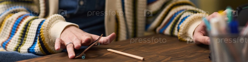 Руки молодого человека, играющего с миниатюрным скейтбором за столом