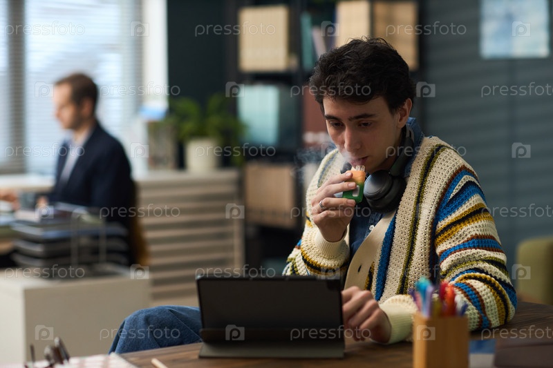 Молодой человек использует вейп, работая на планшете в офисе