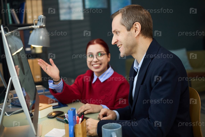 Мужчина средних лет сотрудничает с молодой взрослой женщиной на компьютере