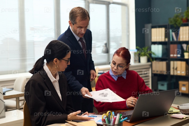 Мужчина средних лет объясняет деловой отчет молодым женщинам в офисе