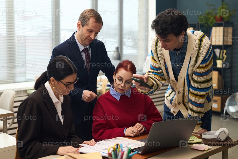 Старшие менеджеры и молодые стажеры, сотрудничающие над проектом в офисе