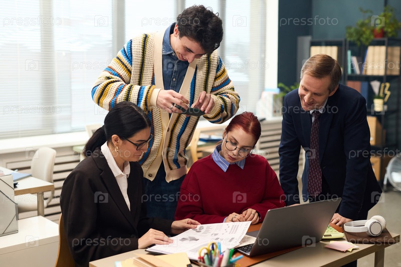 Многонациональная команда сотрудничает в офисе, пока молодой человек фотографирует документальный фильм