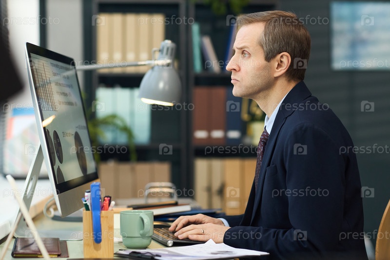 Мужчина средних лет работает на компьютере в современной офисной среде