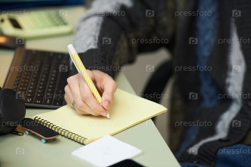 Молодая взрослая женщина пишет заметки на блокноте во время учебы в помещении
