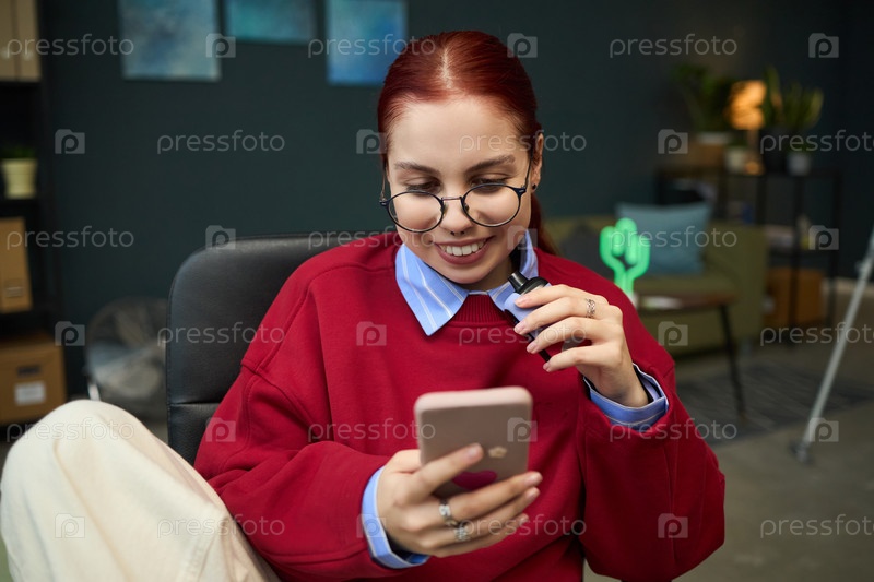 Молодая женщина улыбается, используя смартфон и держа вейп