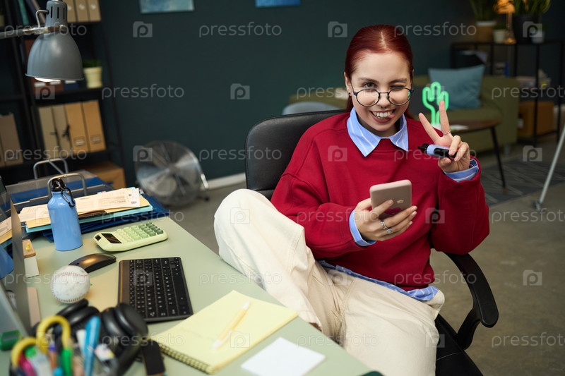 Портрет молодой взрослой женщины, улыбающейся и жестикулирующей знак мира