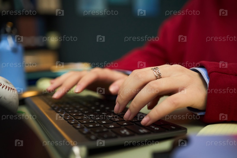 Молодая взрослая женщина печатает на беспроводной клавиатуре в офисной обстановке