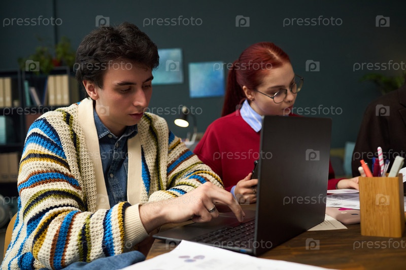 Молодой мужчина и молодая женщина сотрудничают над проектом ноутбука